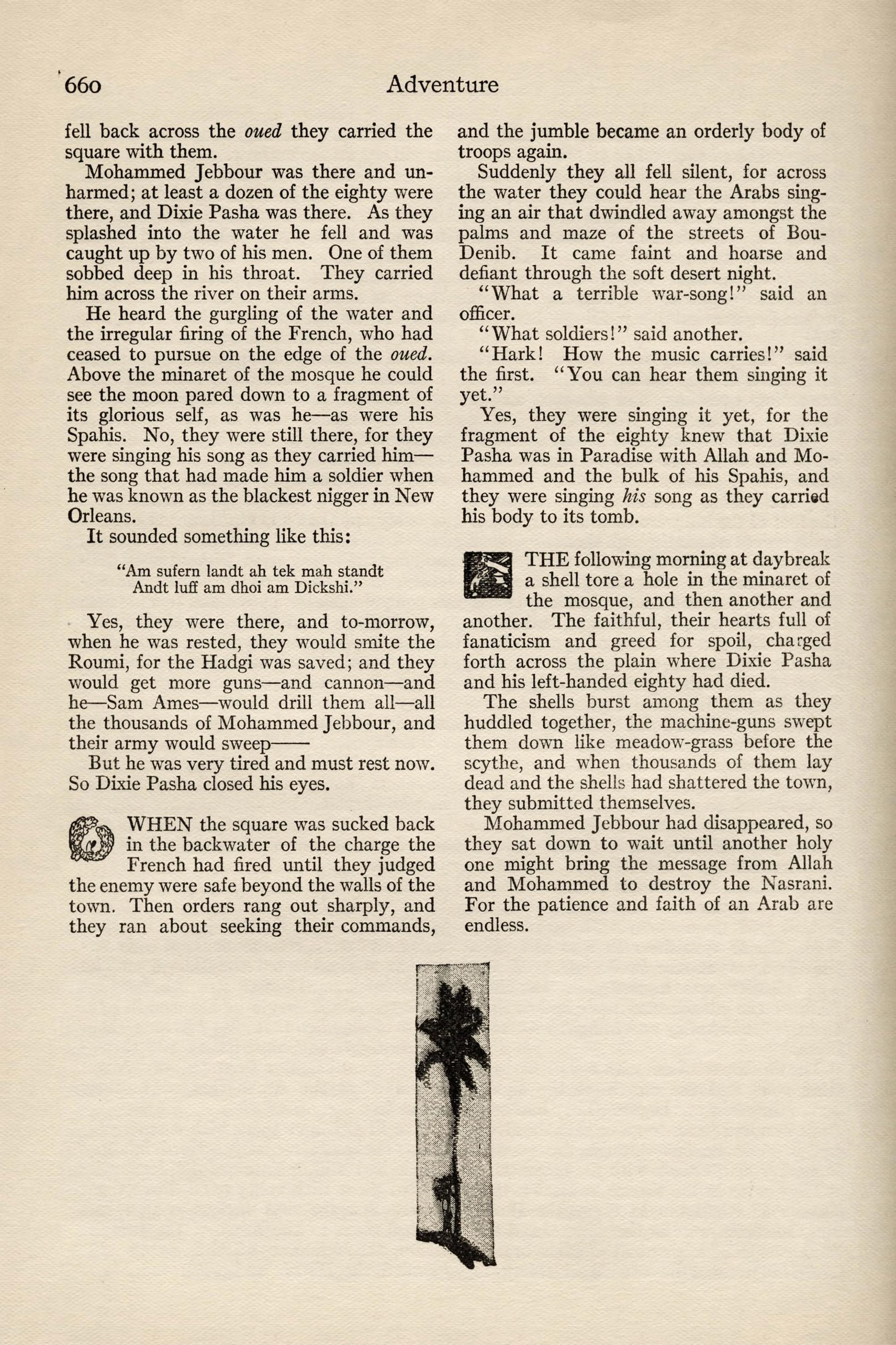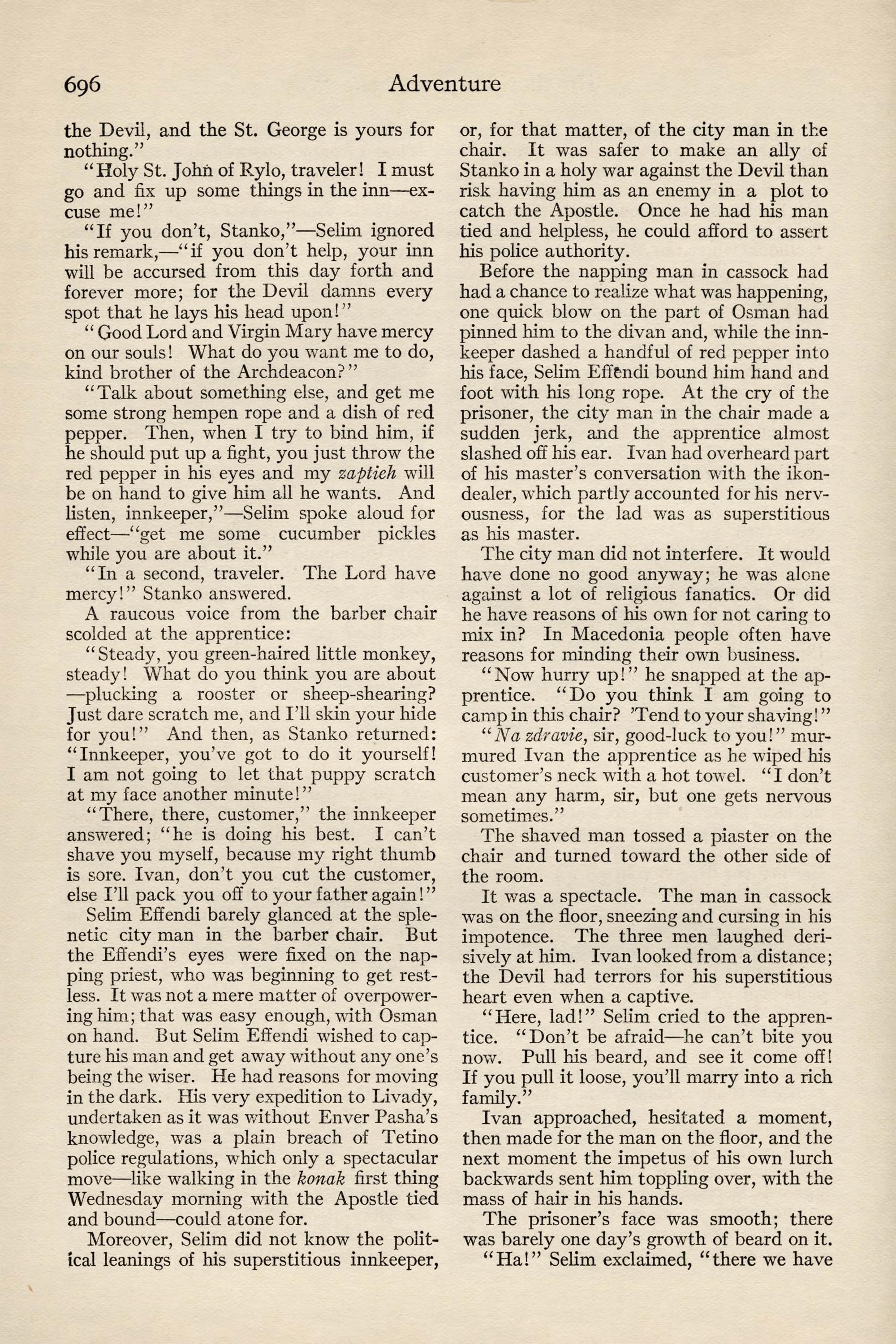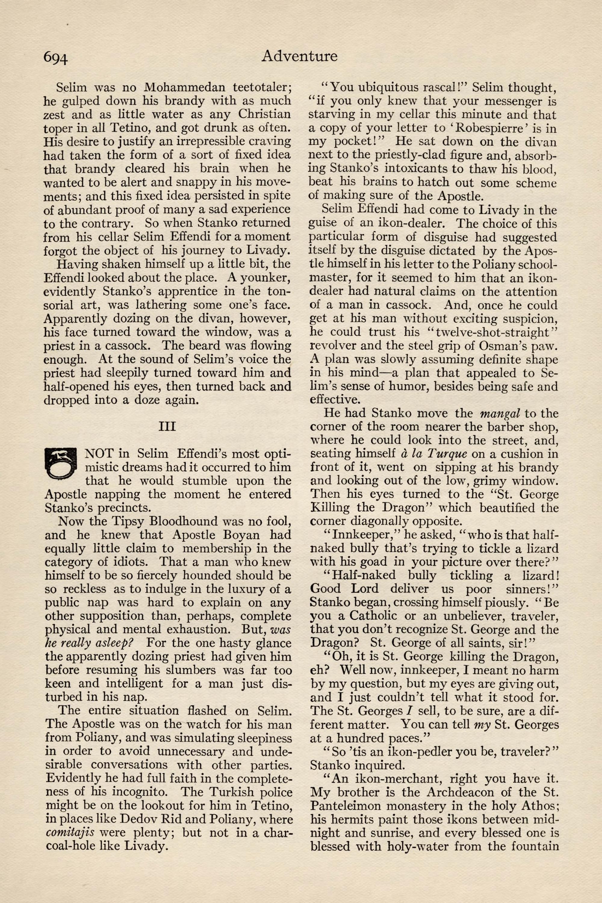 To the Devil in Stanko's Inn, Care of Archdea- con Ananias's brother. From the Den of Lions—- Greeting! He that Prepareth the Way sent you a message last Sunday by a man who never returned. Yours is not a coward's heart, Robespierre; fear not. It was a wise whim of mine, to change my dis- guise; I knew you without being recognized myself. But the little fool that shaved me took too long a time to it, else the Effendi would have found us together. That brat's slow bungling caused your capture. But fear not, my Robespierre. The ikon- dealer will never take you to the bishop. You are worth nothing to him, and Selim Effendi won't have Enver Pasha laugh at his story. It is not cowardice that makes me desert you; I am too much needed now. Keep your mouth locked; and may your papers be never deciphered by Selim and his like. I leave you in your captor's pocket, but fear not. Nobody wants you; you are useless baggage now, and that's your safety. I have bartered my two- mule carriage for the Effendi's horse. A fine animal.