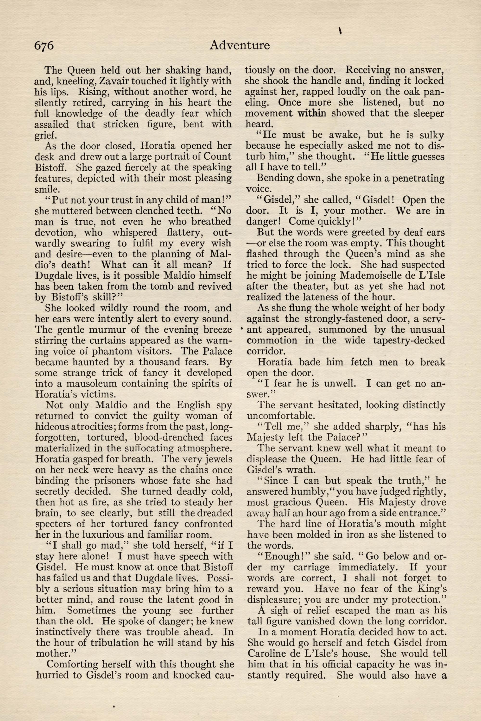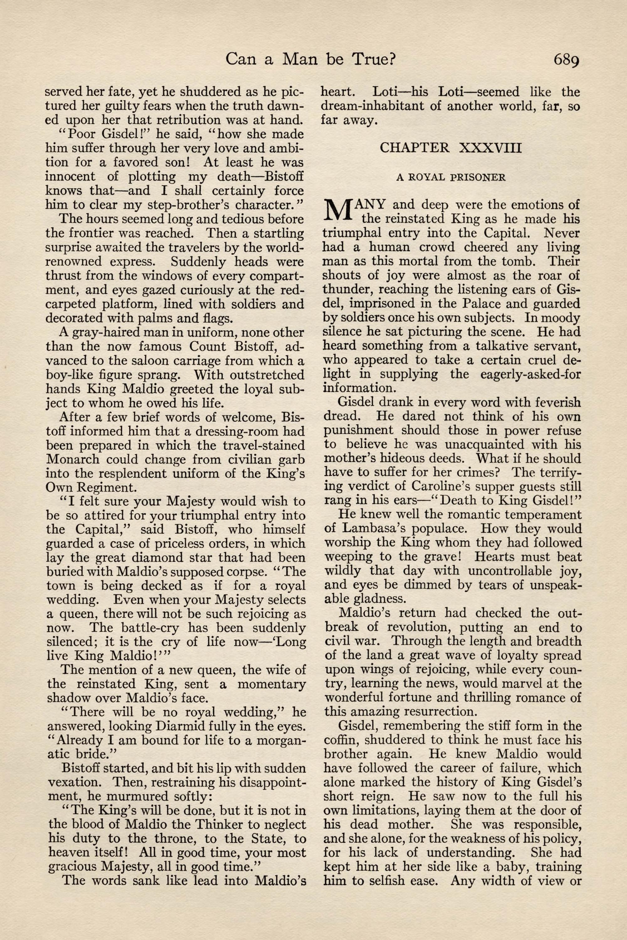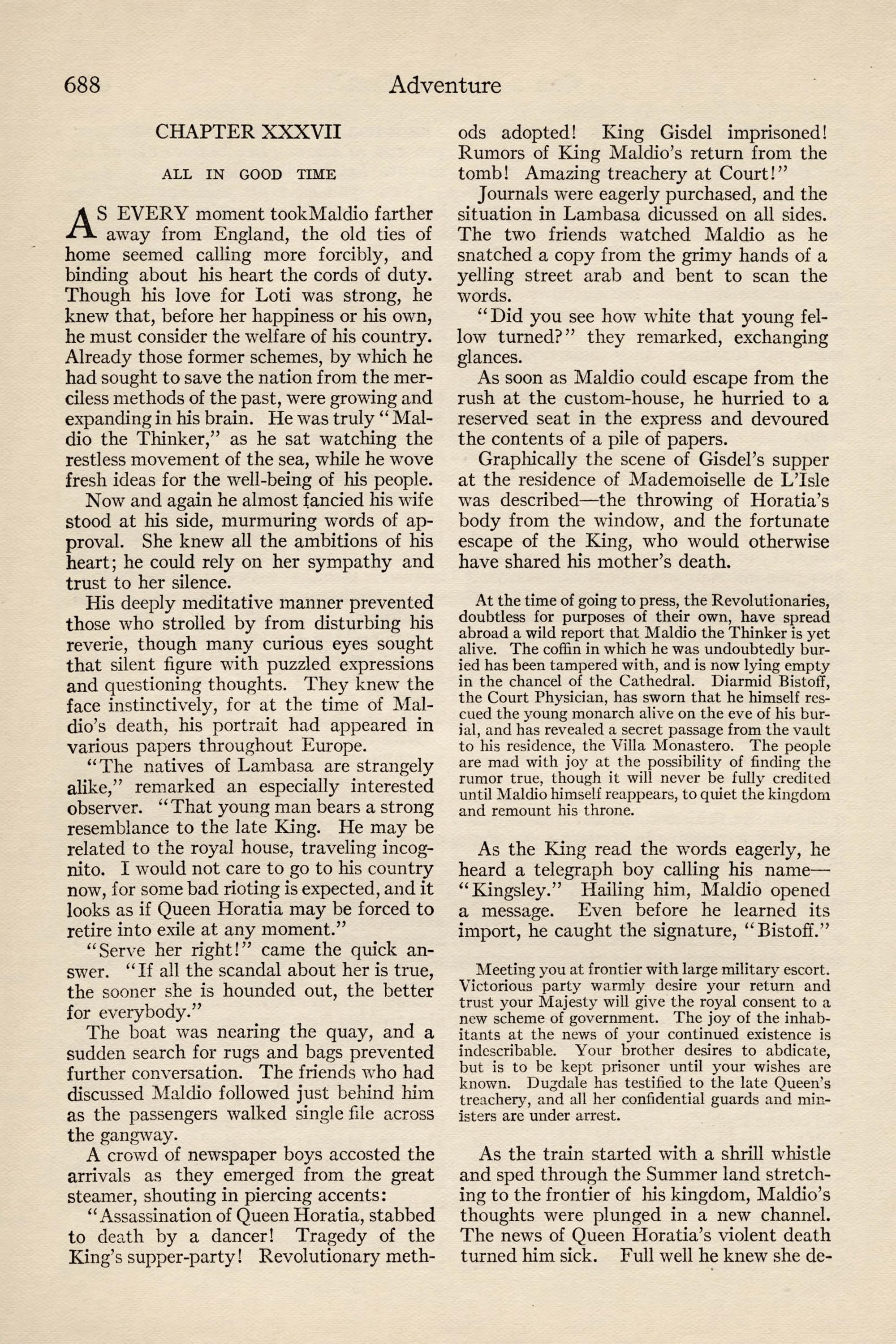 At the time of going to press, the Revolutionaries, doubtless for purposes of their own, have spread abroad a wild report that Maldio the Thinker is yet alive. The coffin in which he was undoubtedly bur- ied has been tampered with, and is now lying empty in the chancel of the Cathedral. Diarmid Bistoff, the Court Physician, has sworn that he himself res- cued the young monarch alive on the eve of his bur- ial, and has revealed a secret passage from the vault to his residence, the Villa Monastero. The people are mad with joy at the possibility of finding the rumor true, though it will never be fully credited until Maldio himself reappears, to quiet the kingdom and remount his throne.