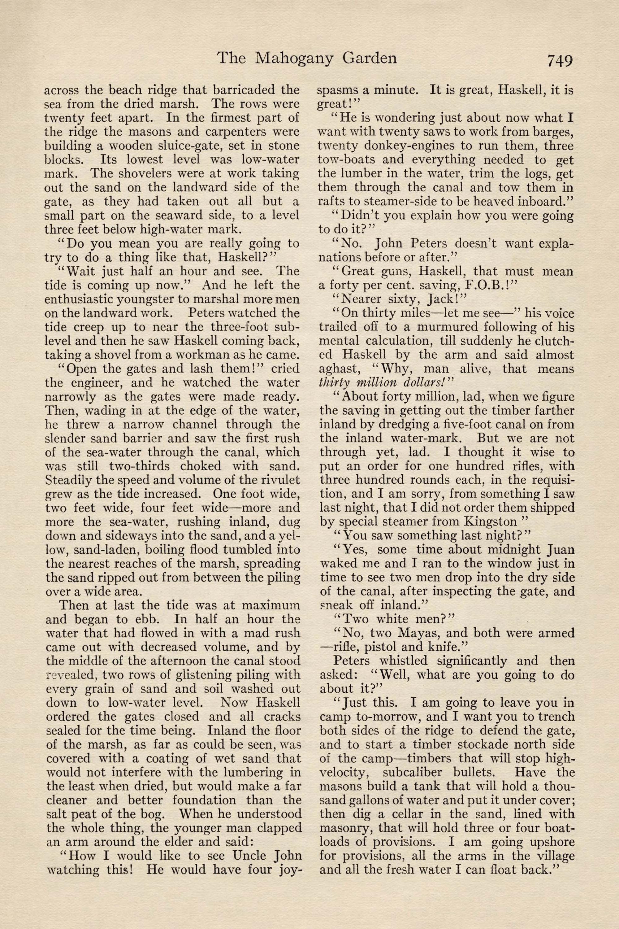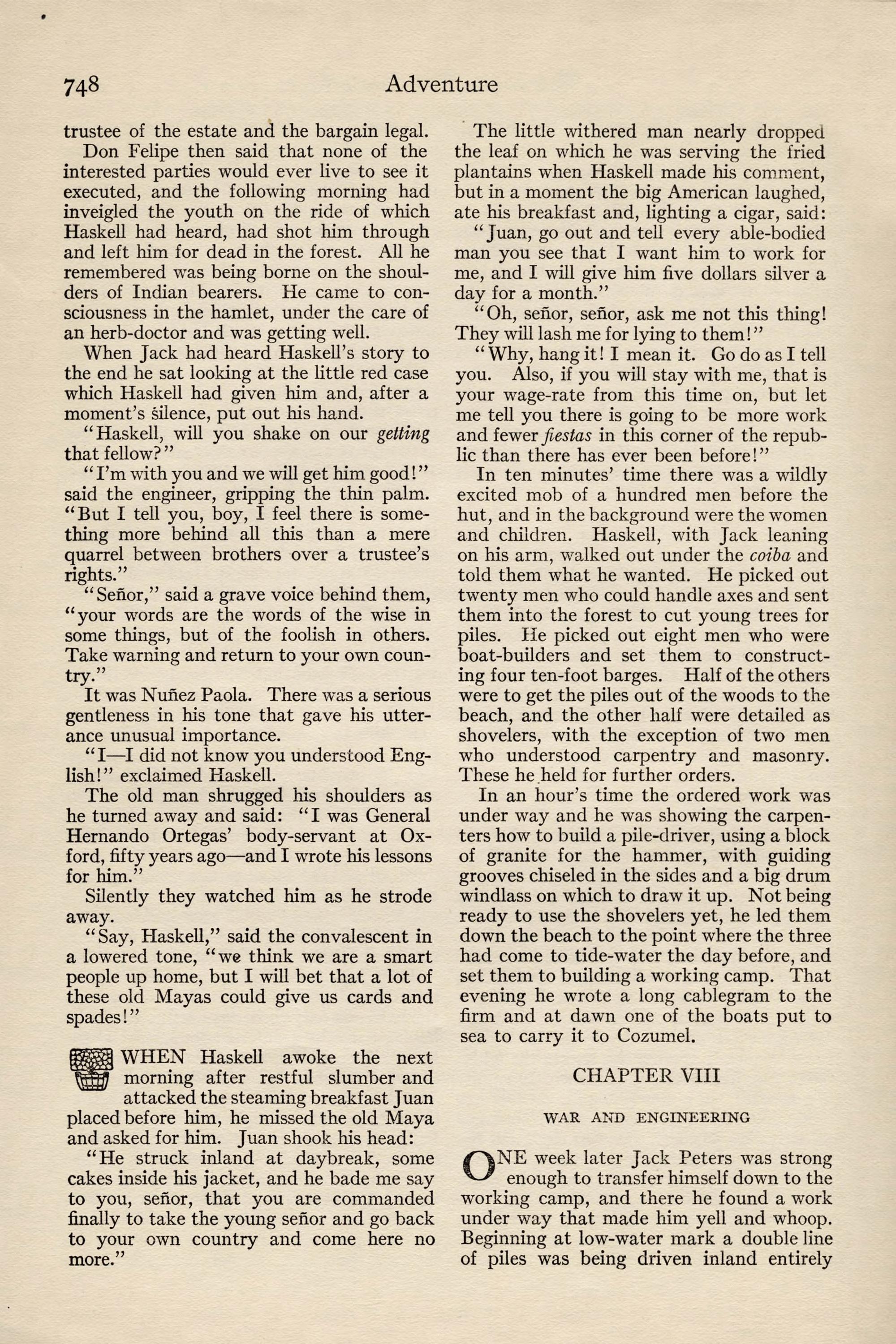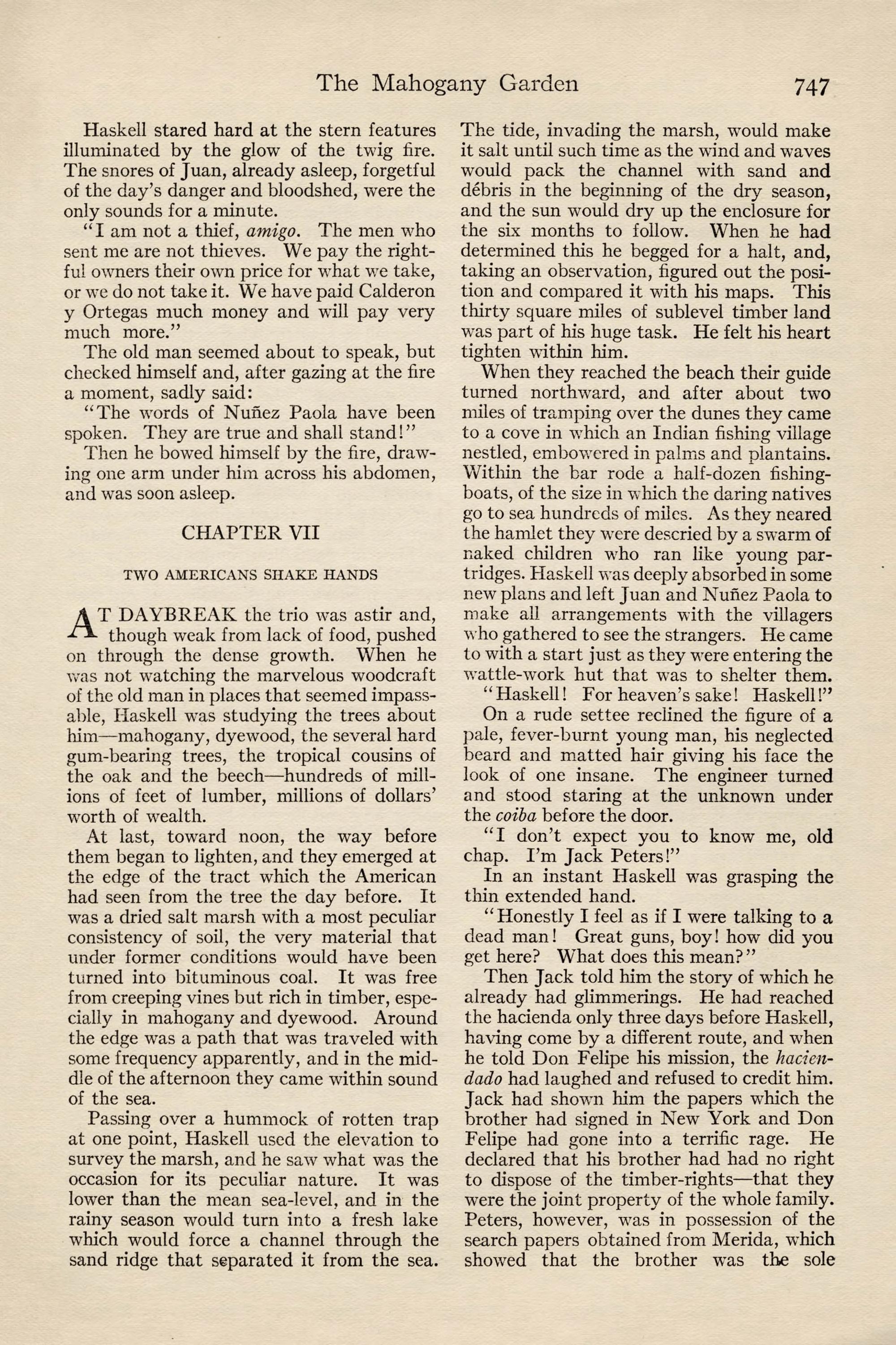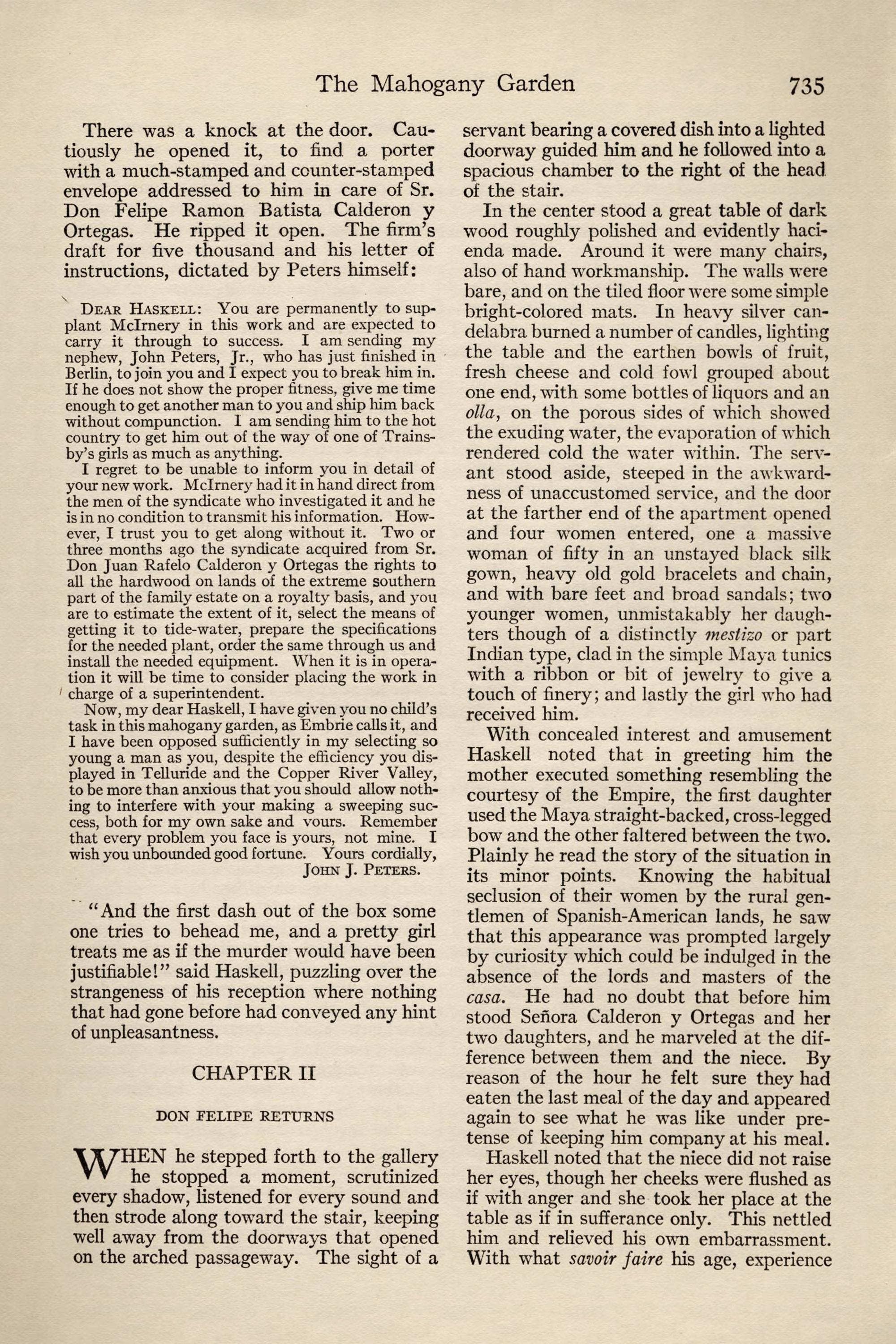 Dear Haskell: You are permanently to sup- plant Mclrnery in this work and are expected to carry it through to success. I am sending my nephew, John Peters, Jr., who has just finished in Berlin, to join you and I expect you to break him in. If he does not show the proper fitness, give me time enough to get another man to you and ship him back without compunction. I am sending him to the hot country to get him out of the way of one of Trains- by's girls as much as anything.I regret to be unable to inform you in detail of your new work. Mclrnery had it in hand direct from the men of the syndicate who investigated it and he is in no condition to transmit his information. How- ever, I trust you to get along without it. Two or three months ago the syndicate acquired from Sr. Don Juan Rafelo Calderon y Ortegas the rights to all the hardwood on lands of the extreme southern part of the family estate on a royalty basis, and you are to estimate the extent of it, select the means of getting it to tide-water, prepare the specifications for the needed plant, order the same through us and install the needed equipment. When it is in opera- tion it will be time to consider placing the work in charge of a superintendent.Now, my dear Haskell, I have given you no child's task in this mahogany garden, as Embrie calls it, and I have been opposed sufficiently in my selecting so young a man as you, despite the efficiency you dis- played in Telluride and the Copper River Valley, to be more than anxious that you should allow noth- ing to interfere with your making a sweeping suc- cess, both for my own sake and vours. Remember that every problem you face is yours, not mine. I wish you unbounded good fortune. Yours cordially,John J. Peters.