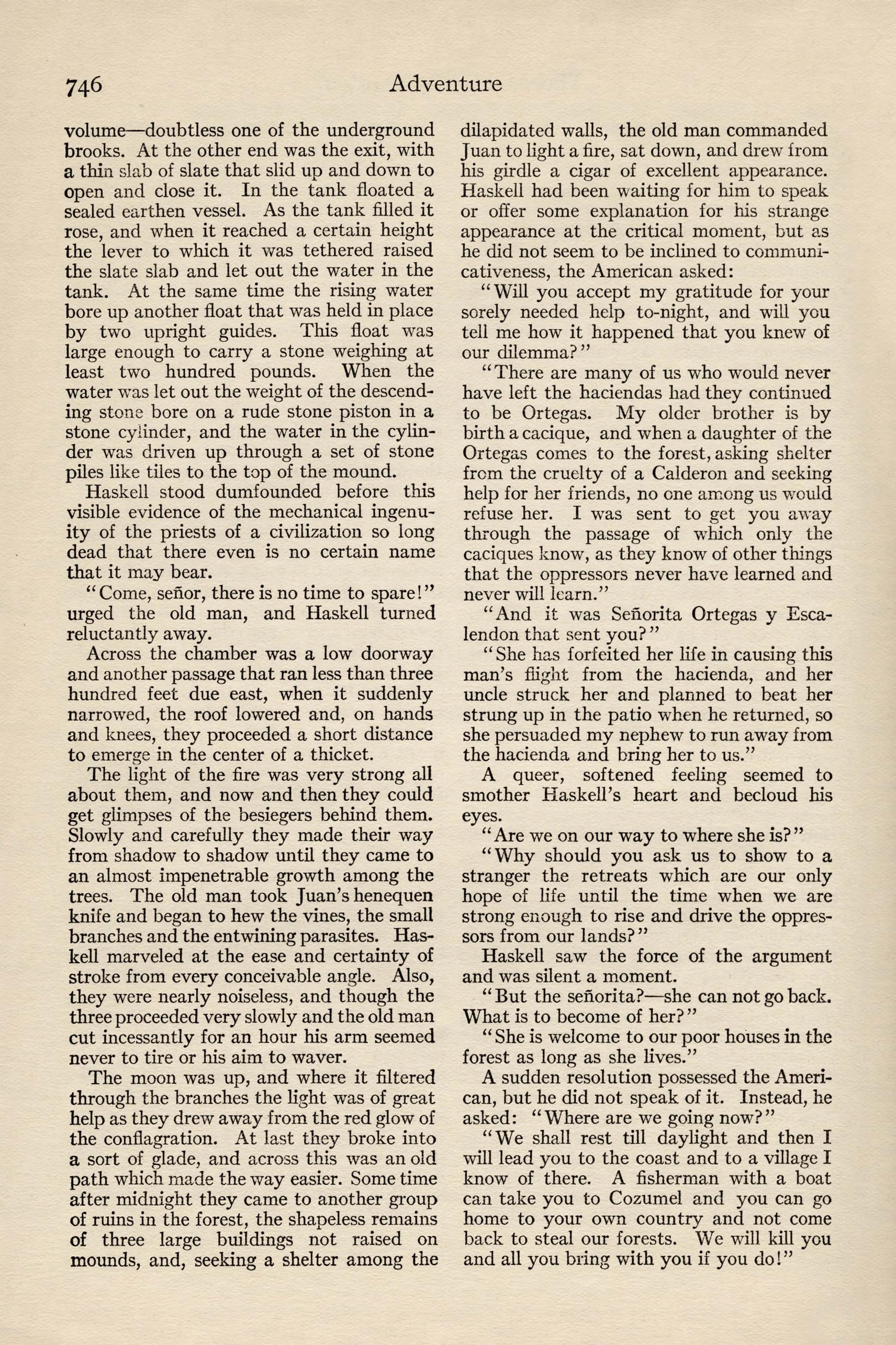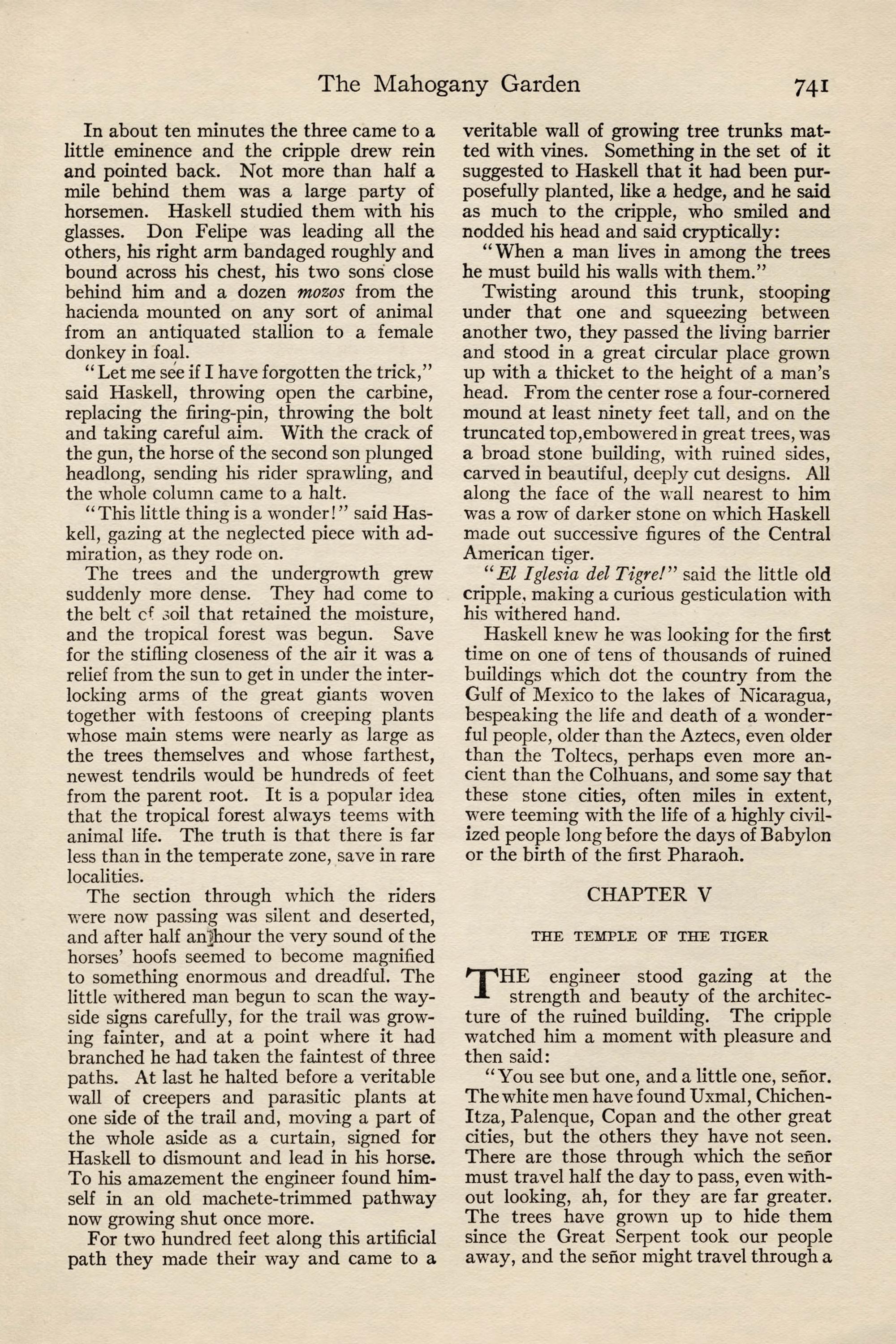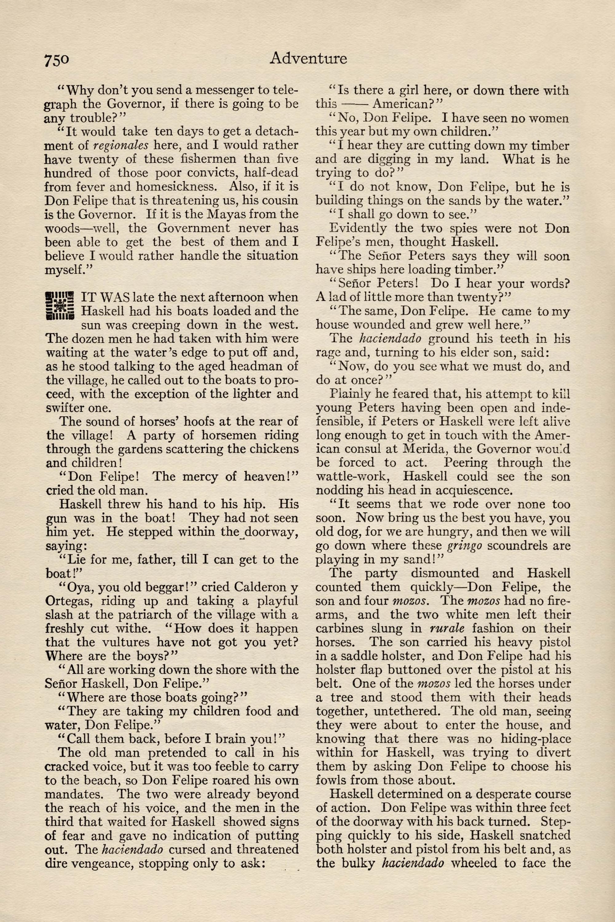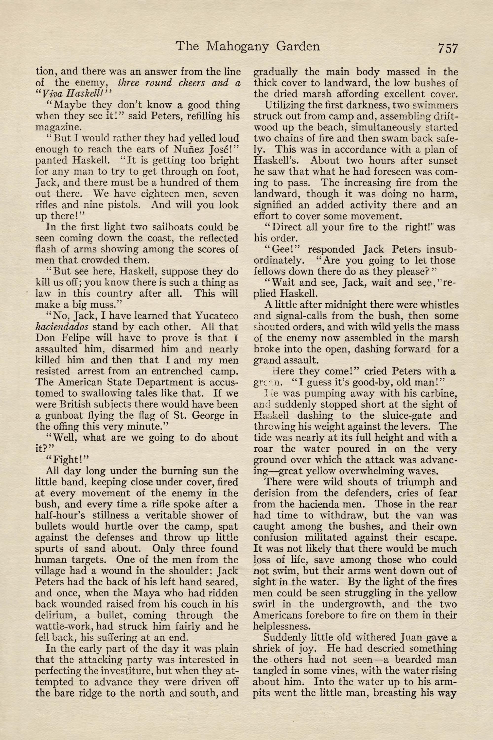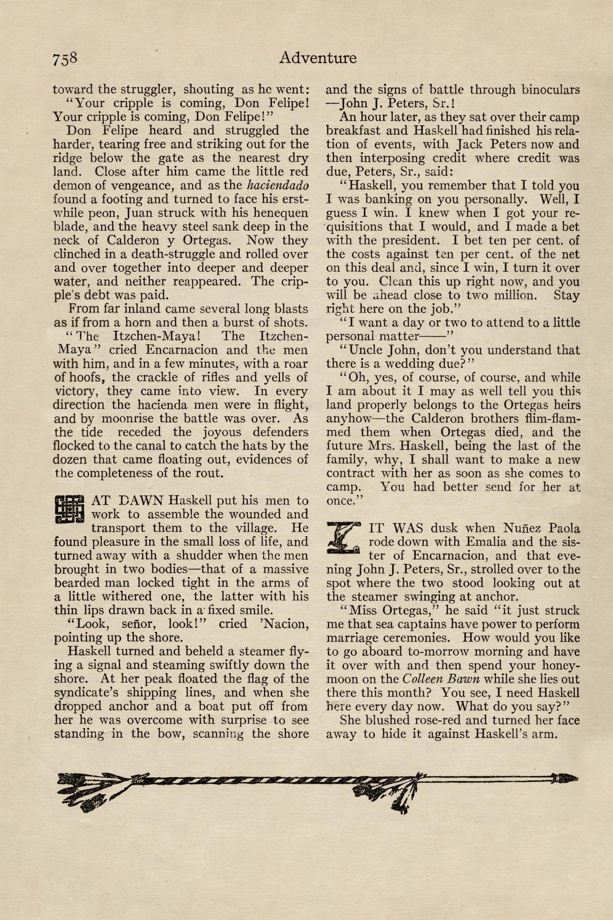 Dear Haskell: You are permanently to sup- plant Mclrnery in this work and are expected to carry it through to success. I am sending my nephew, John Peters, Jr., who has just finished in Berlin, to join you and I expect you to break him in. If he does not show the proper fitness, give me time enough to get another man to you and ship him back without compunction. I am sending him to the hot country to get him out of the way of one of Trains- by's girls as much as anything.I regret to be unable to inform you in detail of your new work. Mclrnery had it in hand direct from the men of the syndicate who investigated it and he is in no condition to transmit his information. How- ever, I trust you to get along without it. Two or three months ago the syndicate acquired from Sr. Don Juan Rafelo Calderon y Ortegas the rights to all the hardwood on lands of the extreme southern part of the family estate on a royalty basis, and you are to estimate the extent of it, select the means of getting it to tide-water, prepare the specifications for the needed plant, order the same through us and install the needed equipment. When it is in opera- tion it will be time to consider placing the work in charge of a superintendent.Now, my dear Haskell, I have given you no child's task in this mahogany garden, as Embrie calls it, and I have been opposed sufficiently in my selecting so young a man as you, despite the efficiency you dis- played in Telluride and the Copper River Valley, to be more than anxious that you should allow noth- ing to interfere with your making a sweeping suc- cess, both for my own sake and vours. Remember that every problem you face is yours, not mine. I wish you unbounded good fortune. Yours cordially,John J. Peters.