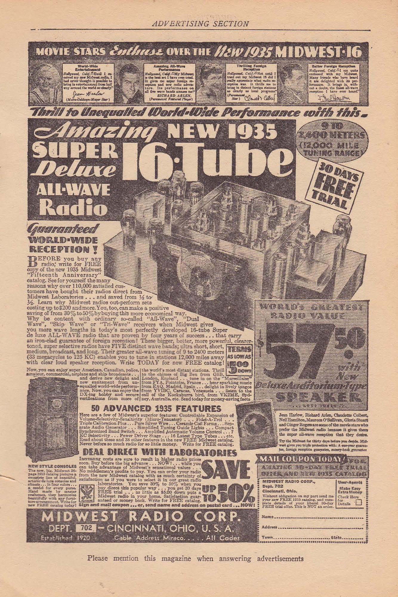 Send Name and Address. Big air-cooled movie, adjustable lamp